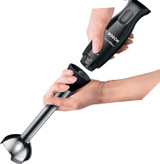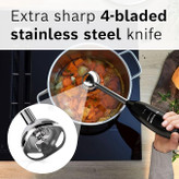 تیغه 4 لبه بسیار تیز این دستگاه که از فناوری QuattroBlade بهره مند شده و از جنس استیل ضد زنگ است، به گونه ای طراحی شده که با استفاده از آن هر ماده غذایی سفت و سخت مانند گوشت، میوه های فریز شده و … را میتوان تکه تکه یا له کرد.